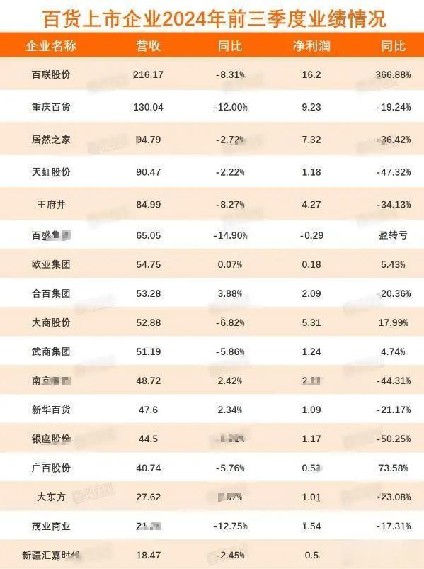 看看2024年一些百货企业的情况,能维持1%到4%的营收增长的屈指可数,大部分公司的营收都明显在往下掉。不光是营收,连企业的利润也是眼看着往下走。
